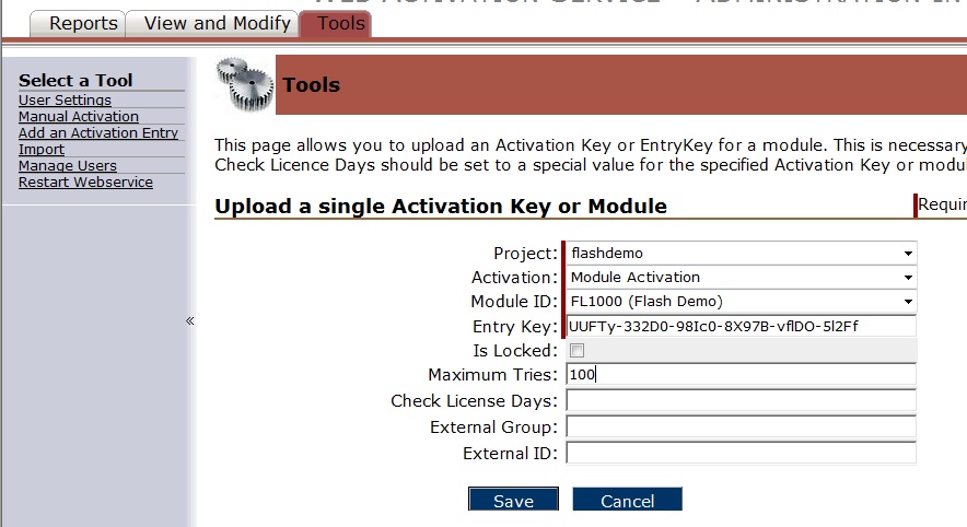 •Add this Serial Number on the 3.0 server. In the Activation Server Administration Interface, select Tools, Add an Activation Entry. It is important to select Module Activation. In the Field Maximum Tries you specify, how often the Serial Number can be used