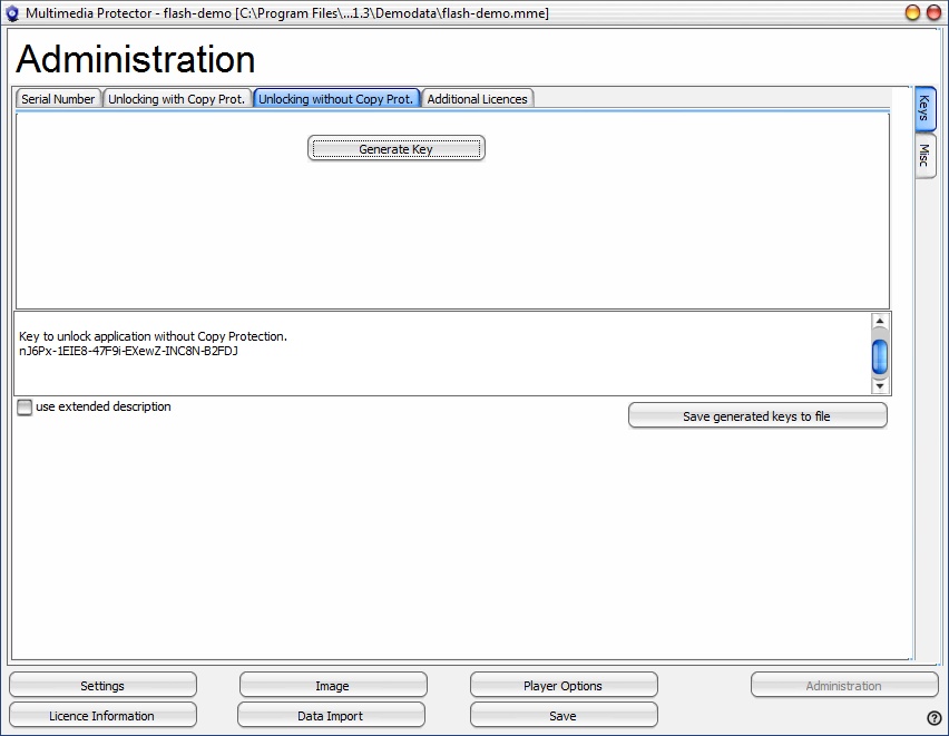 After pressing the button Generate Key, the key including the extended description is copied into the text box. It is also copied into the clipboard. The content of the text box can be saved to a file with the button Save generated keys to file.