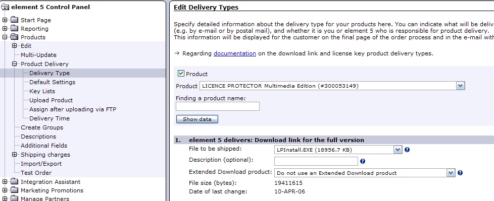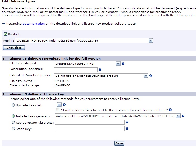 Within the option Delivery Type you specify the Licence Generator which the shop System invokes after the order process. See - Send files to Element5 / Share-it! - how to upload the necessary files.