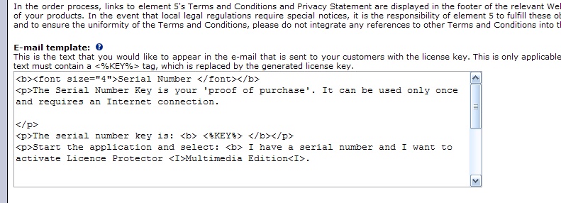 </p> <p>The serial number key is: <b> <%KEY%> </b></p> <p>Start the application and select: <b> I have a serial number and I want to activate (your product name).