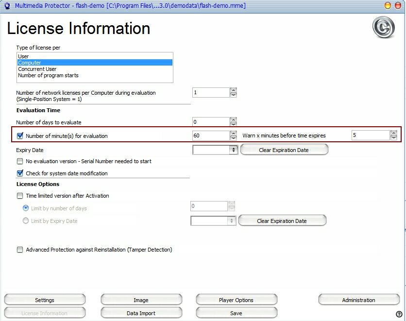 For some applications (like games) an evaluation version limited by number of minutes is better like number of days. The user would get a warning, that the application is terminated. This is specified with the option: Warn x minutes before times expires.