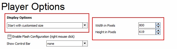 If the video is displayed in the wrong size, e.g. stretched, you have to specify the exact screen resolution in the screen - Player Options. The resolution can be found in the file xy.html of the Camtasia project. Edit this file and search for the line: var fo = new SWFObject( "myflashproject", "csSwf", "800", "619", "7", "#FFFFFF" ). The third value is the width in pixel, the forth value is the height.