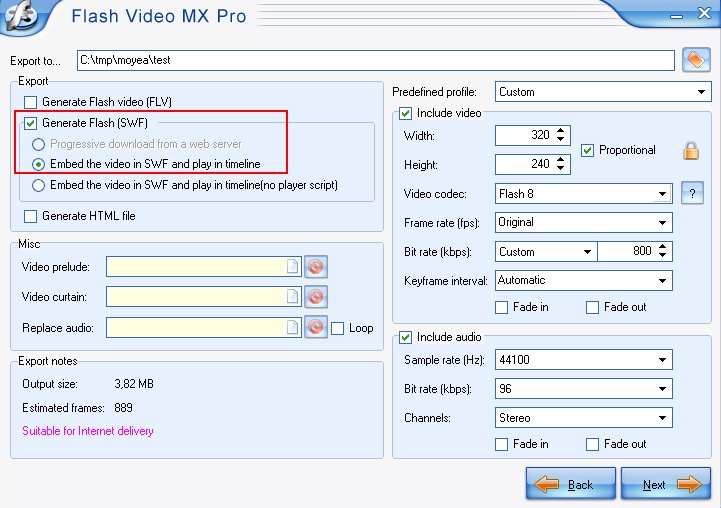 You can define the quality of the video on this page. Import setting is: Embed the video in SWF and play in timeline and Video Codec: Flash 8