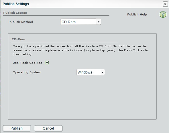 Select Publish Method CD-ROM, Check - Use Flash Cookies and Operating System Windows.