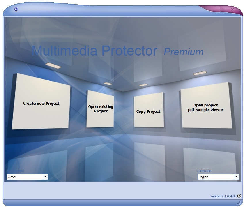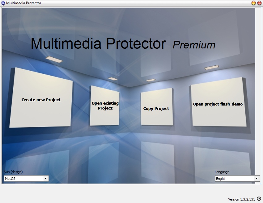 After starting Multimedia Protector the main start screen appears. You can select a Skin and a Language to customize Multimedia Protector.
