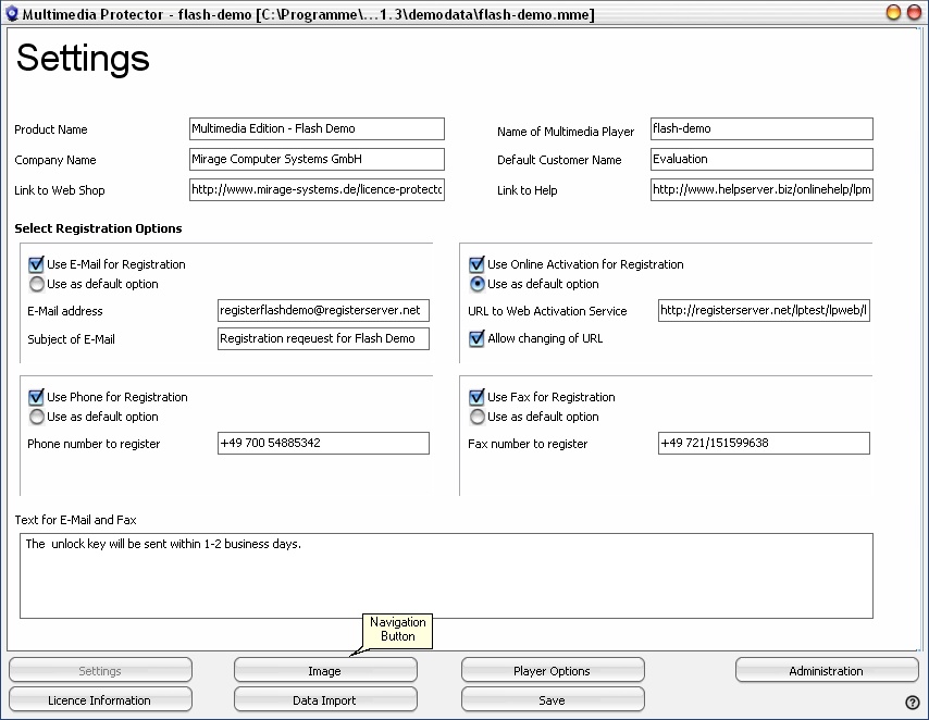 In the lower pane window the navigation buttons can be found. They allow to select a category like Settings or Licence Information and provide access to the online help.