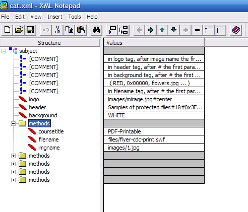 Start the XML notepad and select File, Open. You will see the XML file content which is structured. The content can be easily modified and saved.