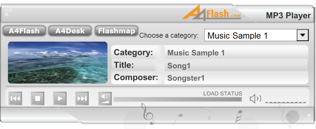 The buttons, category, title and composer can be defined. The free player is limited to 10 songs. If you want an unlimited player or player with your own logo, you can buy it directly on the A4flash Website - Click here to buy