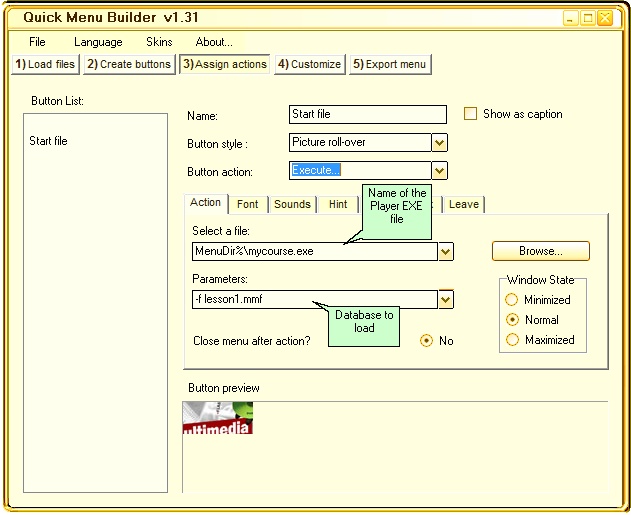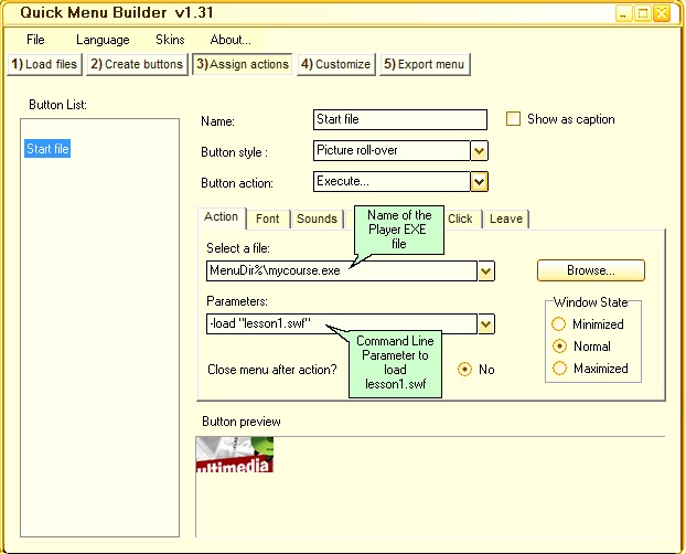 After defining buttons to invoke e.g. lesson 1, lesson 2 you specify in the Assign actions Tab the Button action: Execute... to invoke the Multimedia Player.exe file.
