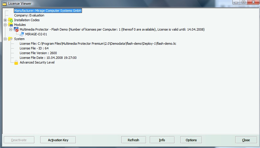 The License Viewer is part of the Multimedia Player and is a complete administration interface for the end user. It can be accessed from any screen during the activation and registration process with the link Show License Information. The License Viewer can also be invoked by starting the Multimedia Player with the parameter -v (see Start Options) or it can be added in the program manager group using the installer (parameter ShowLicenseInfo).