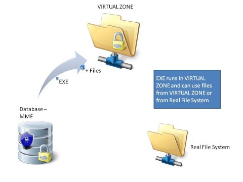 The VIRTUAL ZONE simulates a disk. If the EXE file opens another file or starts another application, the file is first searched in the VIRTUAL ZONE. If the file is not found on the VIRTUAL ZONE, it is searched in the real file system. This technique ensures, that an application runs without modification. An access to the VIRTUAL ZONE from outside is not possible - all files are completely protected during runtime. This also offers a perfect protection for .NET and Java.