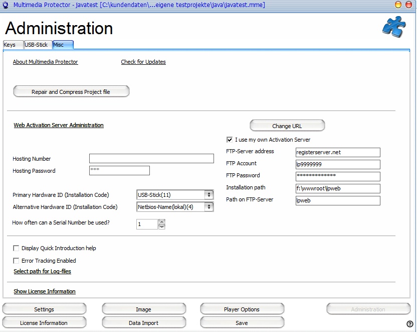 •FTP-Server address: name of the FTP Server like registerserver.net •FTP Account: FTP account user name •FTP Password: password - always use a password with this FTP account •Installation path - path where the Activation Server was installed •PATH on FTP Server - path to the Activation Server server directory, relative to the home directory