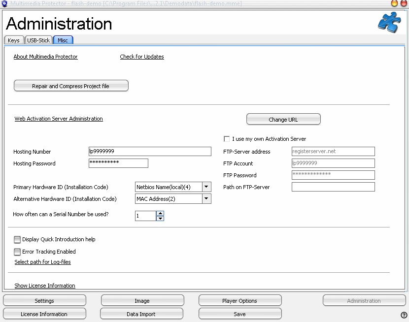 Type in your Hosting Number and Hosting password as well. This is necessary before you upload the configuration files to the Activation Server. Deleting the Hosting Number will reset the project settings to values for the Test Server.
