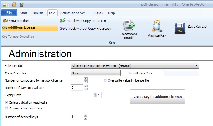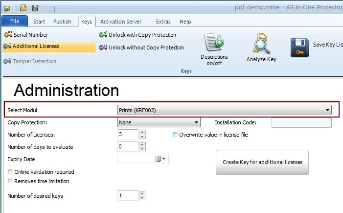 If the PDF option: Limit number of print copies for PDF files is selected, an Activation Key can be generated, which allows the user to add additional print copies for his license. Select the module: Prints. The number of licenses field then includes the number of print copies you add.
