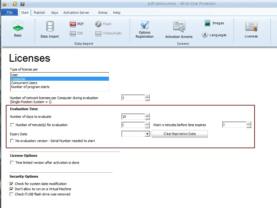 For some applications (like games) an evaluation version limited by number of minutes is better like number of days. The user would get a warning, that the application is terminated. This is specified with the option: Warn x minutes before times expires.