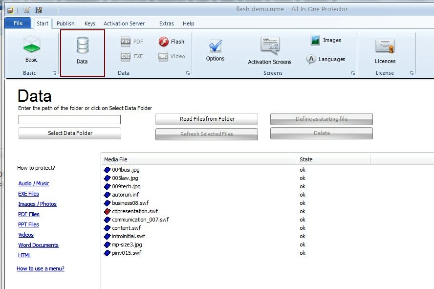 Now select a Start file press the button: Define as starting file. The file is indicated with a red icon. This file is the file that is played after the start of the All-In-One Player and must be a .SWF (flash) , .PDF (Adobe PDF), EXE (executable) or video / audio file.