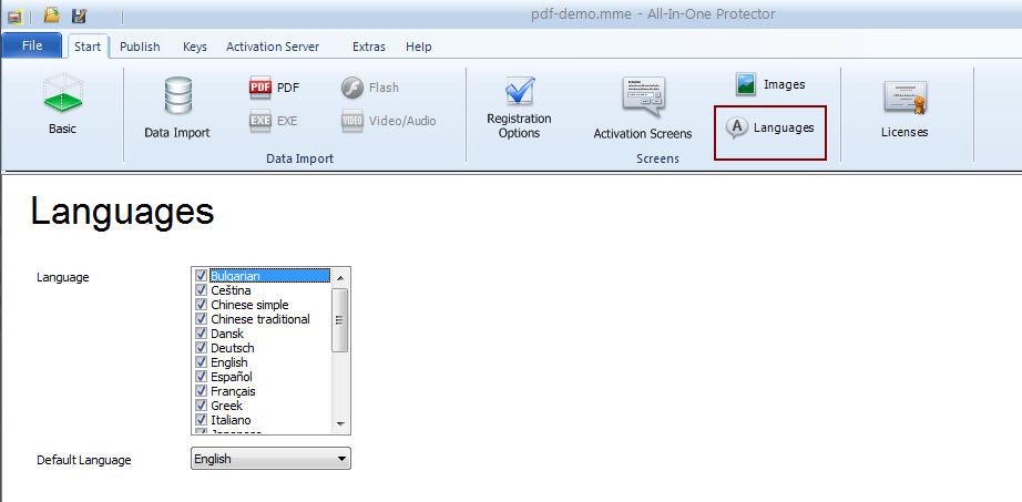 Select one or multiple languages for the registration and activation dialogs. The user can select the language within the first registration dialog.