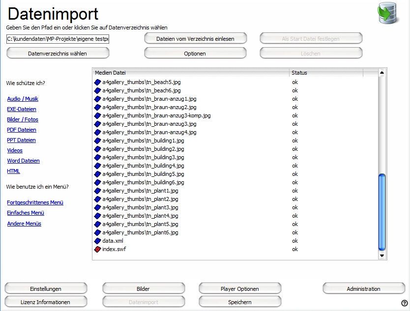 Importieren Sie nun alle Dateien des Projektordners (wählen Sie den Ordner a4gallery) und definieren Sie die Datei "index.swf" als Startdatei.