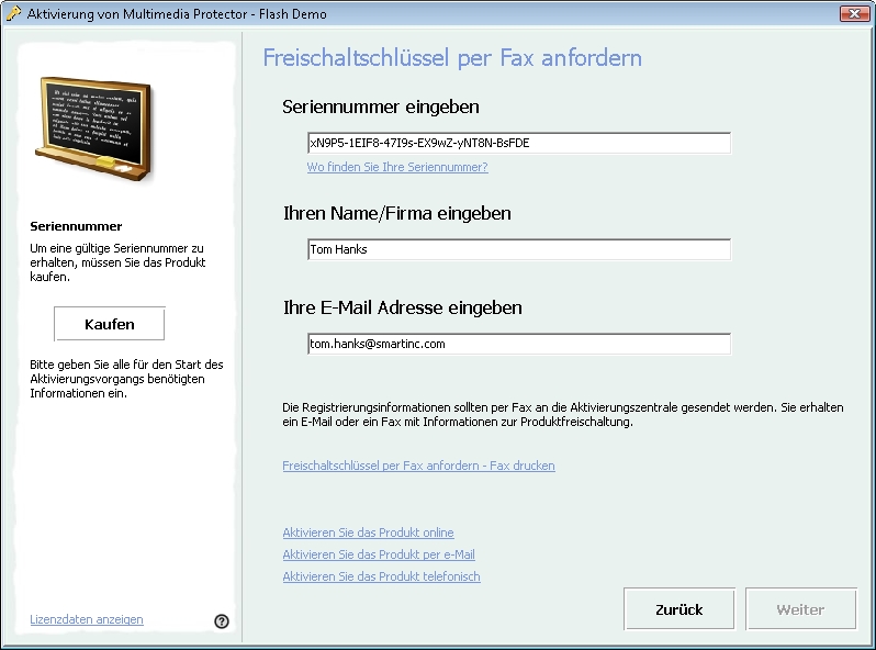 Die Fax Aktivierung benötigt sowohl die Eingabe einer Seriennummer, des Firmennamens, als auch einer gültige E-Mail Adresse. Nachdem Sie die Eingaben getätigt haben, wird eine E-Mail mit den erforderlichen Hardware IDs und Lizenzinformationen erstellt. Sie müssen hiernach dem Kunden einen Schlüssel zur Aktivierung des Kopierschutzes zusenden (siehe auch: Eingabe des Freischaltschlüssels). Weitere Details zum Arbeitsablauf erhalten Sie hier.