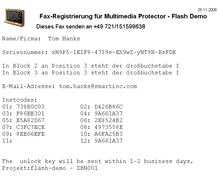 Nachdem Sie die benötigten Daten eingegeben haben, klicken Sie auf "Freischaltschlüssel per Fax anfordern - Fax drucken". Hiernach wird ein Bericht mit den erforderlichen Hardware IDs und Lizenzinformationen erstellt. Drucken Sie diesen nun aus und senden ihn an die im Bericht angegebene Faxnummer. Ein Freischatschlüssel wird Ihnen innerhalb der nächsten 2-3 Werktage zugestellt.