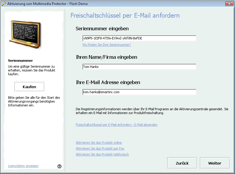 Die E-Mail Aktivierung benötigt sowohl die Eingabe einer Seriennummer, des Firmennamens, als auch einer gültige E-Mail Adresse. Nachdem Sie die Eingaben getätigt haben, wird eine E-Mail mit den erforderlichen Hardware IDs und Lizenzinformationen erstellt. Sie müssen hiernach dem Kunden einen Schlüssel zur Aktivierung des Kopierschutzes zusenden (siehe auch: Eingabe des Freischaltschlüssels). Weitere Details zum Arbeitsablauf erhalten Sie hier.