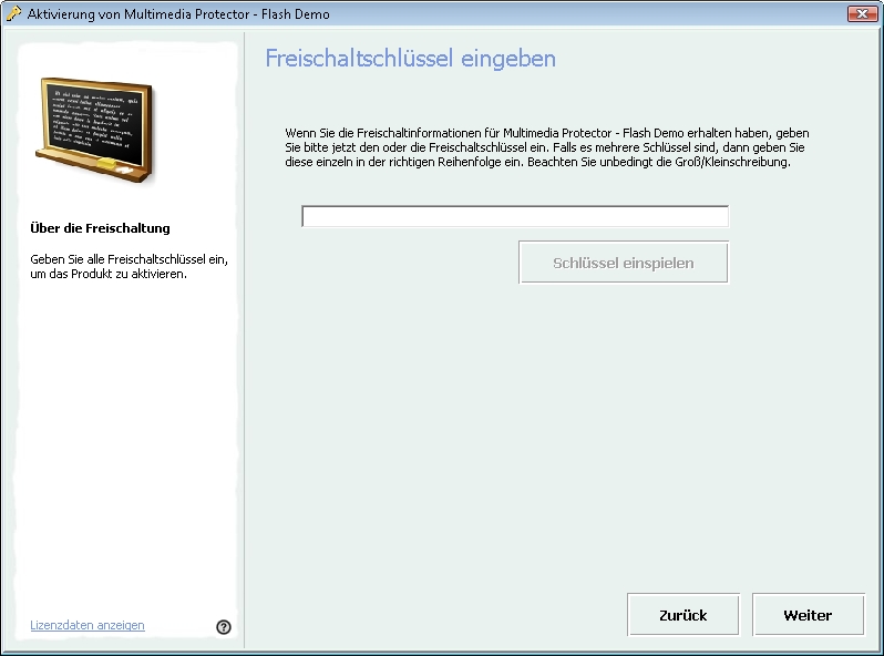 Nach anfordern des Freischaltschlüssels per E-Mail, erhalten Sie beim nächsten Start der Anwendung folgenden Dialog: