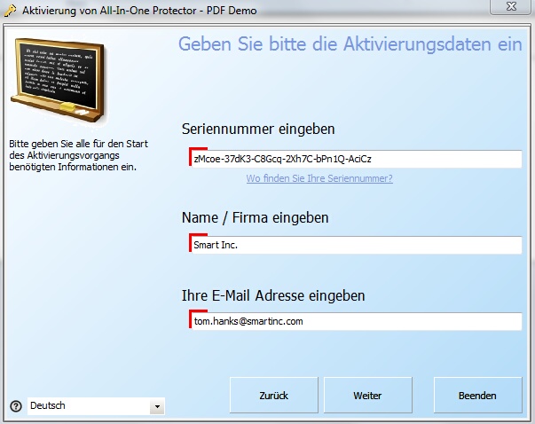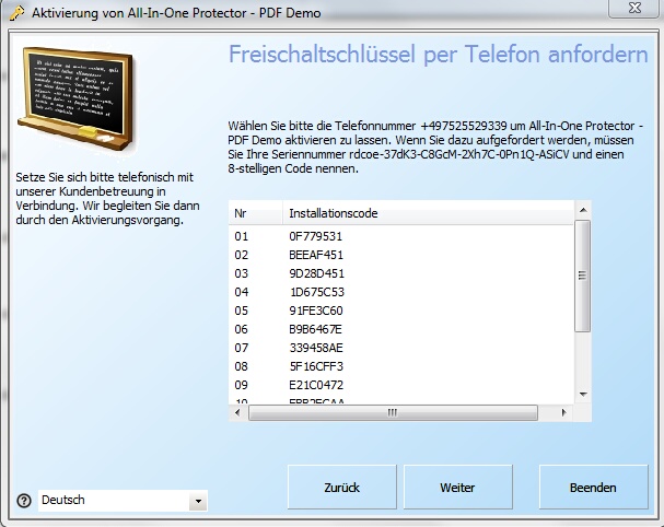 Rufen Sie nun die im Dialog angegebene Telefonnummer an. Sie werden zuerst nach Ihrer Seriennummer und dem Installationscode gefragt. Der Freischaltschlüssel wird Ihnen telefonisch übermittelt. Geben Sie diesen in das Feld "Freischaltschlüssel" ein und klicken auf die Schaltfläche "Schlüssel einspielen".
