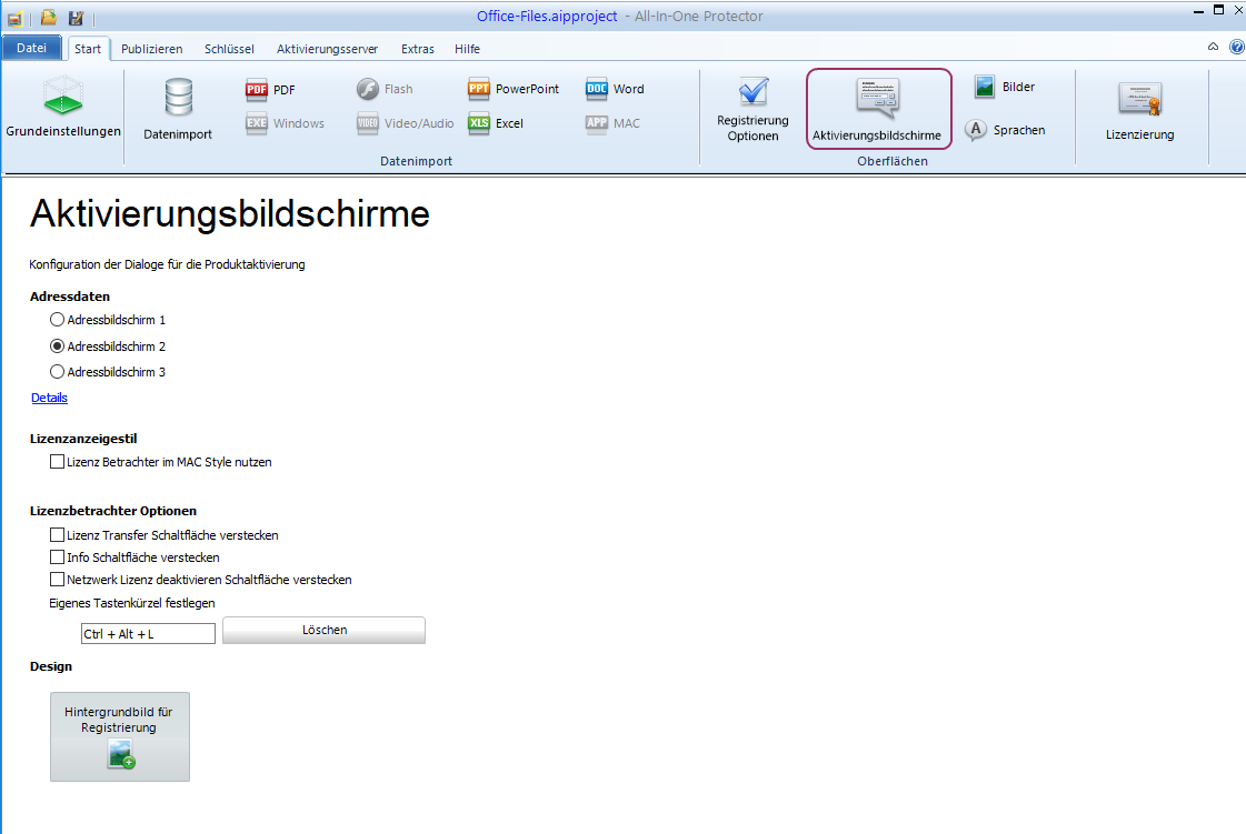 Hier legen Sie Eigenschaften für die Aktivierungsbildschirme fest.