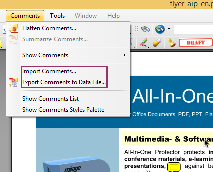 Anmerkungen und Notizen können exportiert und in eine andere PDF Datei importiert. Das ermöglicht Ihnen ein Update einer PDF Datei zum Kunden zu senden und dieser kann die Notizen von einer älternen Version der PDF Datei importieren.