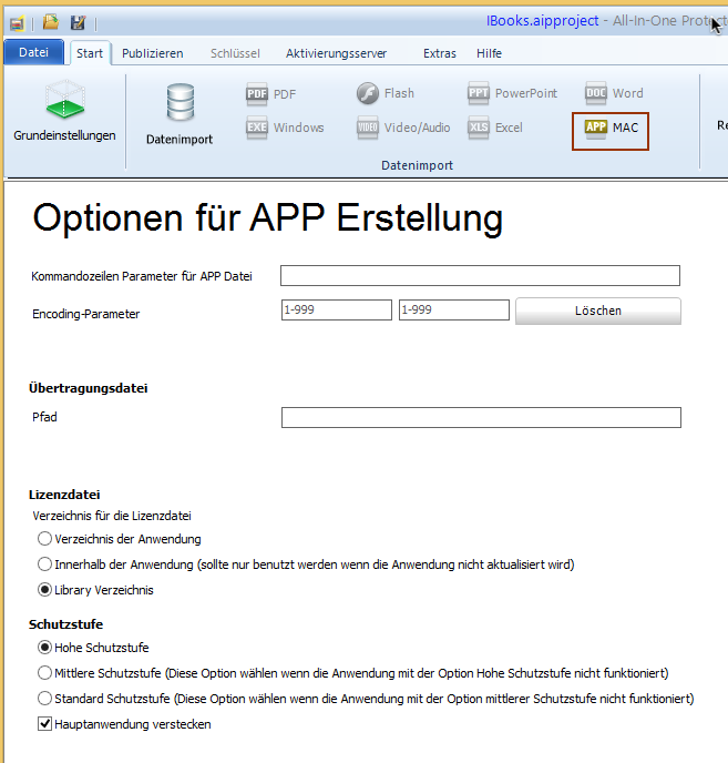 •Hohe Schutzstufe - das ist die Standard Option. Ändern Sie diese nur wenn die Anwendung nicht ordnungsgemäß läuft. Die APP Datei ist gegen Dekompilieren geschützt