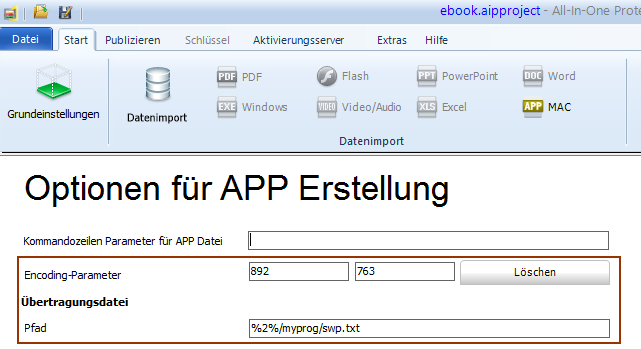 Der APP Datei kann eine fest programmierte Kommandozeile übergeben werden.