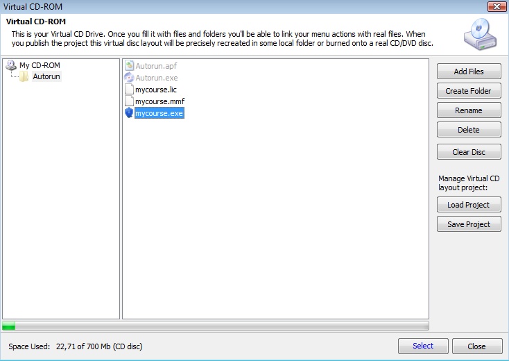 Alle Dateien, die zum dem Projekt gehören, sind auszuwählen. Wählen Sie das Menü Project,Virtual CD-Rom. Wählen Sie die Schaltfläche Add button um Ihre Projektdateien vom Publish All Media Verzeichnis auszuwählen. Das Ergebnis sollte so ähnlich aussehen.