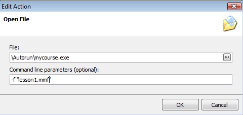 Wählen Sie die Aktion: Open, Open File. In der Zeile File to run geben Sie den Pfad und den Namen Ihrer All-In-One Player.exe an. Im Feld Command line parameters geben Sie das Kommando, zum Ausführen einer spezifischen Datei an. Siehe auch: Starten einer spezifischen Datei innerhalb der Datenbank.geben