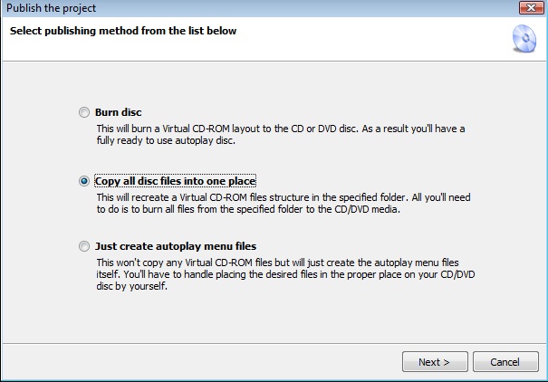 Wählen Sie im Hauptmenü den Menüpunkt Project, Publish. Wählen Sie hiernach die Option "Copy all disc files into one place", um Ihr Projekt zu testen.