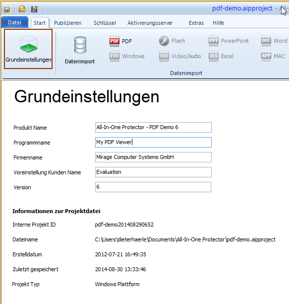 Die Grundeinstellungen für das Projekt werden hier festgelegt.