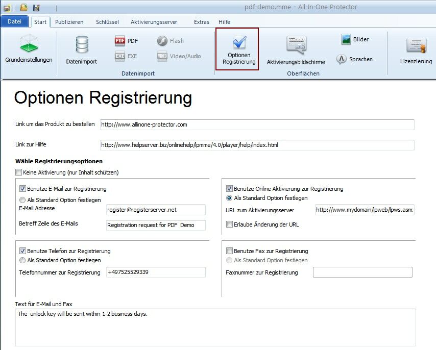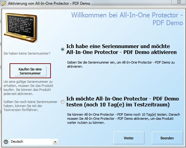 Wurde ein Link hinterlegt, so erscheint in den Registrierungs- und Aktivierungsdialogen die Schaltfläche "Kaufen Sie eine Seriennummer". Der Link sollte direkt auf Ihre Bestellseite verweisen.