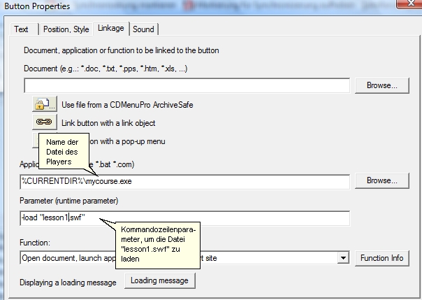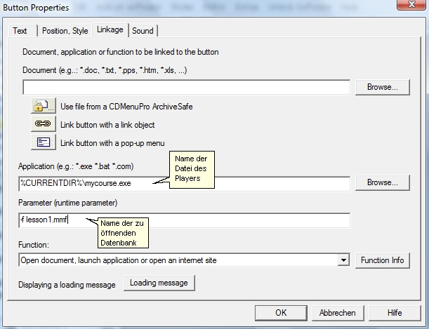 Nach Erstellung der einzelnen Schaltflächen, können Sie diesen im Dialog "Button Properties", den aus der Datenbank zu startenden Dateien zuweisen. Wählen Sie hierzu im Feld Application den Pfad und Namen Ihrer All-In-One Player.exe, aus dem Publish All Media Verzeichnis aus. Es ist die Datei mit dem blauen Schutzschild.