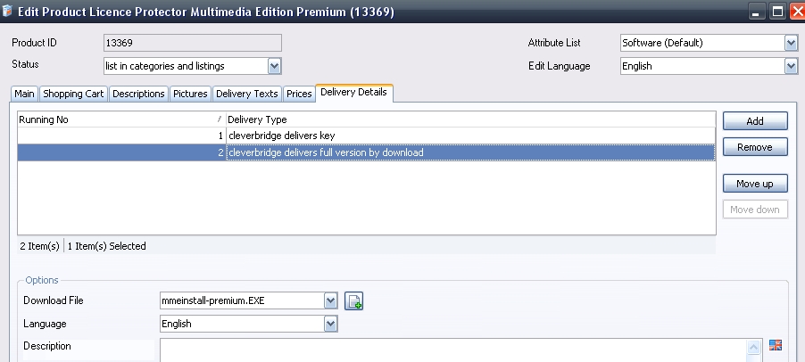 Klicken Sie nun auf die Schaltfläche Add und wählen die Option Cleverbridge delivers full version by download. Selektieren Sie hiernach unter Download File die von Ihnen hochgeladene Projektdatei.