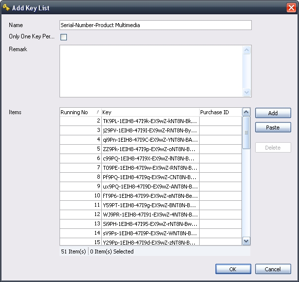 Geben Sie den Namen der Schlüsselliste ein, klicken auf die Schaltfläche Add und wählen die zuvor erstellte Schlüsselliste aus. Siehe auch: Schlüsselliste mit Seriennummern erstellen.