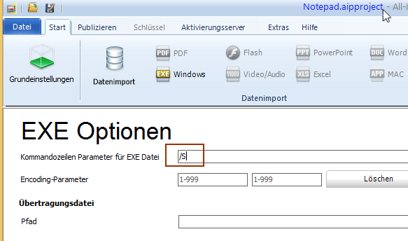 •Im Dialog der EXE Optionen , wird ein Kommandozeilenparameter festgelegt, z.B. /S