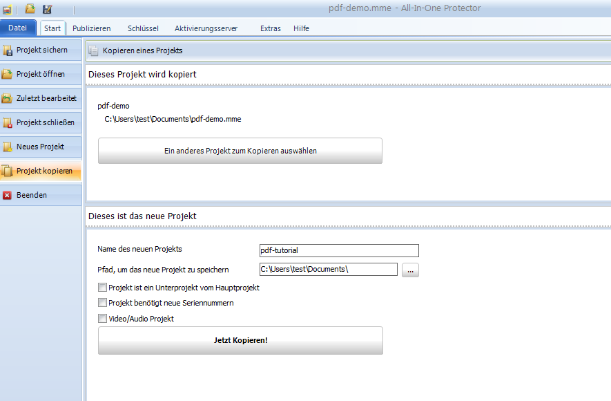 Sie können ein bereits existierendes Projekt mit all dessen Einstellungen kopieren. Hierzu wählen Sie die Option "Projekt kopieren" im TAB Datei aus. Im Dateidialog können Sie nun die zu kopierende Projektdatei auswählen. Sie erhalten hiernach die Möglichkeit einen neuen Projektnamen und