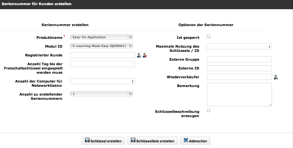 Wenn Sie generell mit dem Aktivierungsserver arbeiten, ist die empfohlene Vorgehensweise die Seriennummer über die Browser basierte Oberfläche des Aktivierungsserver zu erstellen. Dies bietet mehrere Vorteile: