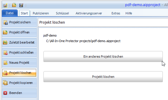 Hier kann ein Projekt mit allen Unter Projekten gelöscht werden. Dies löscht die Projektdateien auf dem Computer aber das Projekt ist immer noch auf dem Aktivierungsserver verfügbar, damit weiterhin Seriennummern erstellt werden können oder eine Produktaktivierung möglich ist.