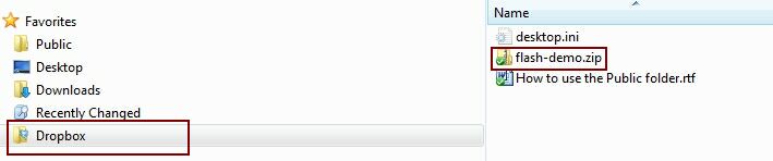 Klicken Sie jetzt auf die Datei, die Sie verteilen möchten (flash-demo.zip) und benutzen Sie den rechten Mausklick. Im Menü wählen Sie Dropbox und dann Copy Public Link. Der Download Link befindet sich jetzt in der Zwischenablage und Sie können den Link zu Ihren Anwendern e-mailen.