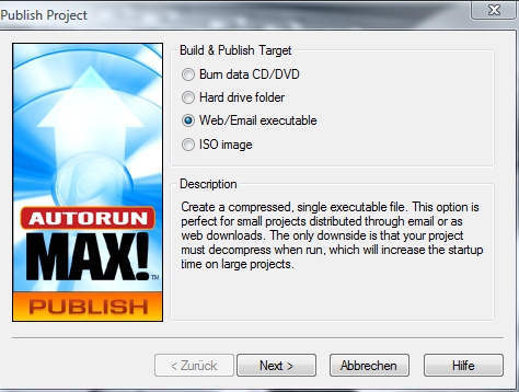 Wählen Sie unter Publish Projekt die Option Web/Email executable.