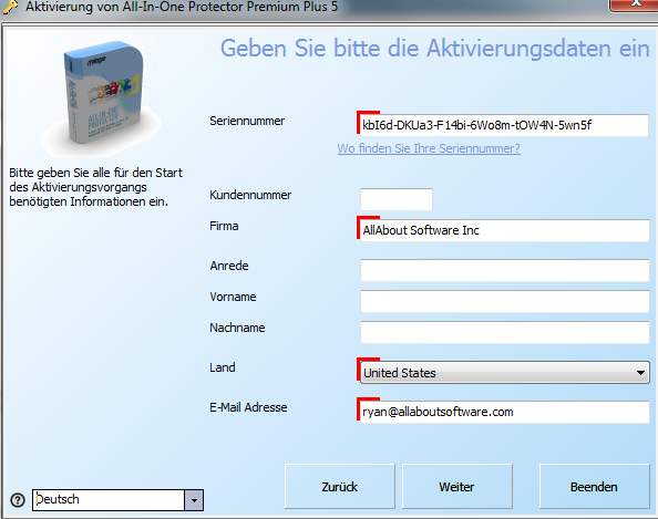 Die Online Aktivierung benötigt die Seriennummer, Name oder Firmenname und Ihre E-Mail Adresse. Nach Klicken auf die Schaltfläche "Weiter" wird Ihre Lizenz Online überprüft und aktiviert. Es ist kein weiterer Schritt notwendig. All-In-One Protector kann nun auf Ihrem PC eingesetzt werden.