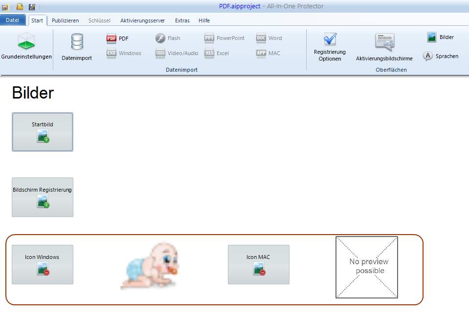 •Die Titelzeile des All-In-One Protector PDF Betrachter, All-In-One Protector SWF Player und All-In-One Protector Video Player ändert sich. Die Titelzeile einer Anwendung benutzt das Original Icon der Anwendung