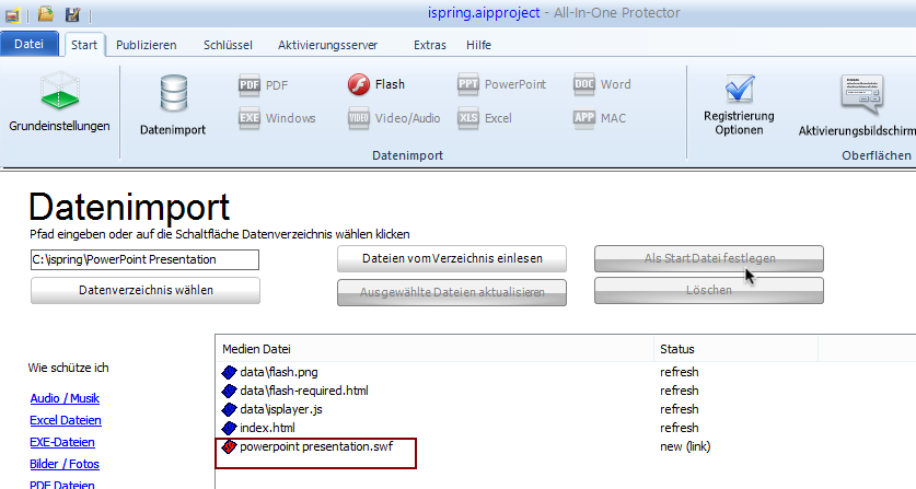 Importieren Sie nun alle Dateien des Projektordners und definieren Sie die Datei .swf als Startdatei.