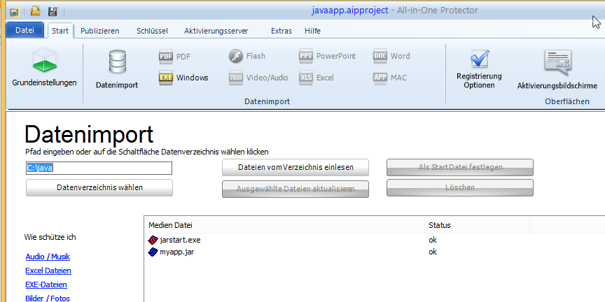 Importieren Sie jetzt alle Dateien und markieren Sie die Datei jarstart.exe als Startdatei.