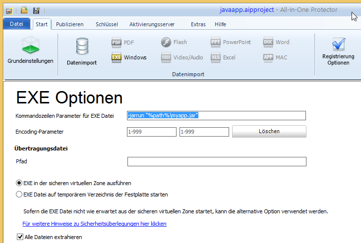 Wenn die Java Anwendung immer die selben Startparameter benötigt, können diese in das Feld: Kommandozeilen Parameter für EXE Datei abgelegt werden. Dazu die Schaltfläche Optionen, TAB EXE Optionen wählen.